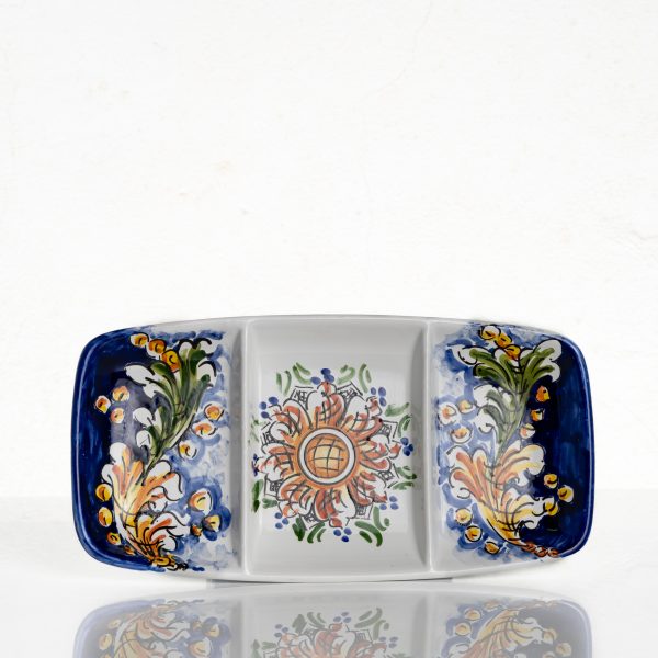 Antipastiera in ceramica interamente realizzata e decorata a mano in stile Ornato come da trazione di Caltagirone.