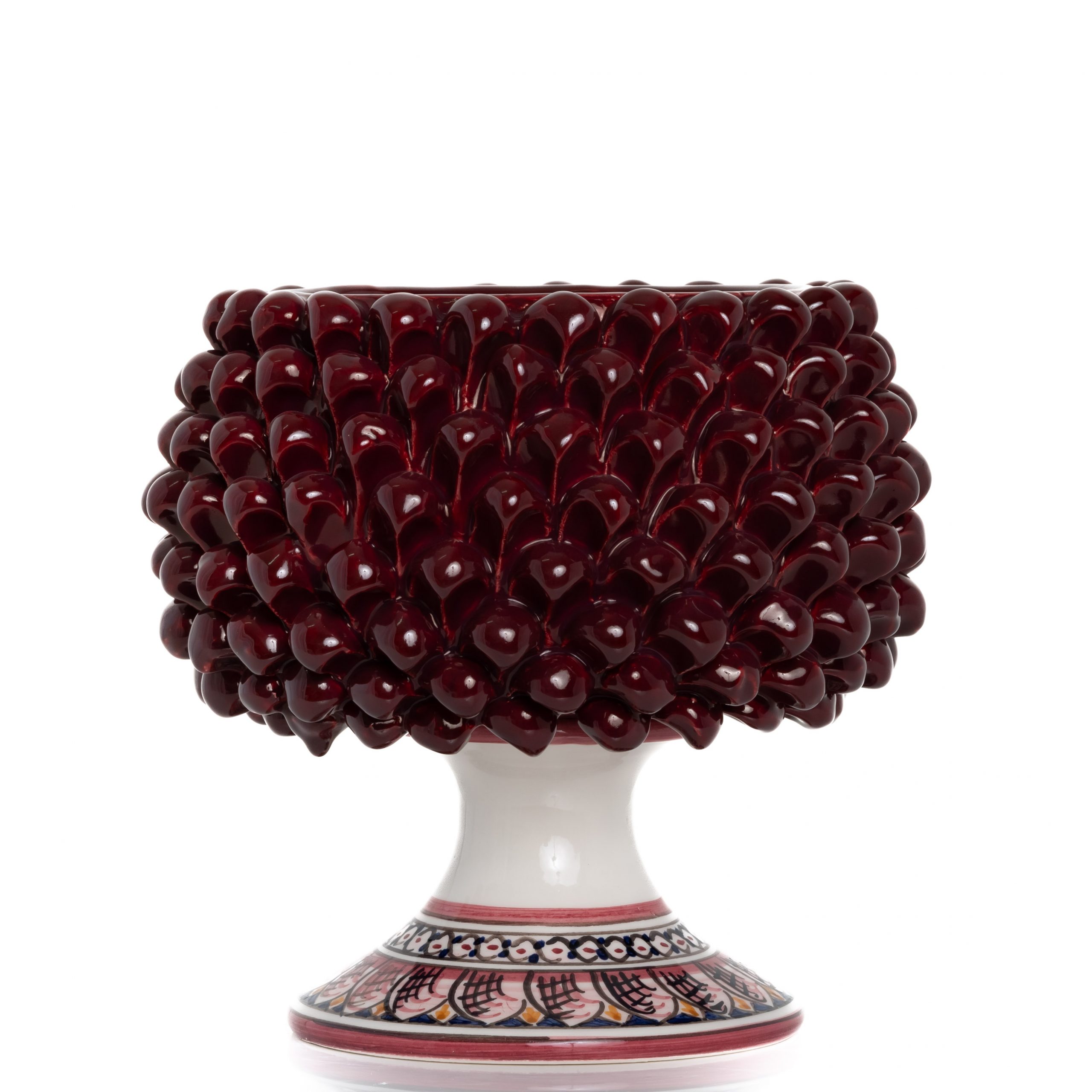 Cachepot mezza pigna Bordò con piede decorato completamente realizzato a mano.