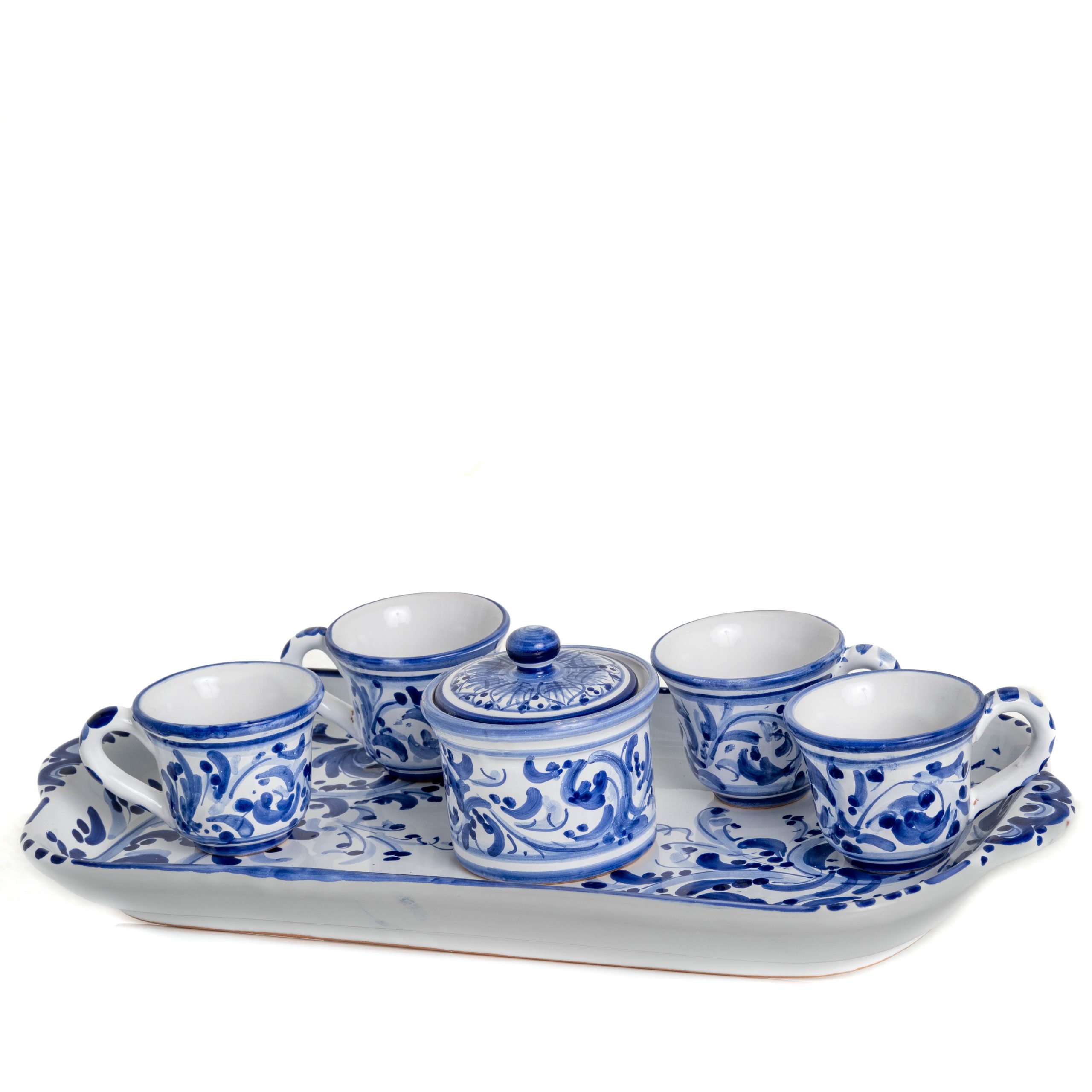 Set da caffè in ceramica interamente realizzato e decorato a mano in stile Seicentesco come da trazione di Caltagirone.