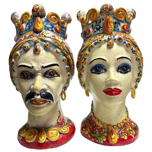 Le teste di Moro sono tipiche dell’arte e dell’artigianato della Sicilia e hanno radici che risalgono all’epoca dell’influenza moresca e araba sull’isola durante il Medioevo. L’arte moresca e araba ha avuto un’influenza significativa sull’architettura, l’artigianato e la cultura siciliana, e le teste di Moro sono un riflesso di questa ereditĂ .